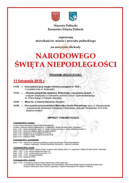 Starosta Pułtuski oraz Burmistrz Miasta Pułtusk zapraszają mieszkańców miasta i powiatu na uroczyste obchody Święta Niepodległości 11 listopada.