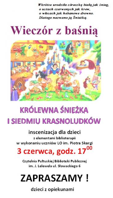 Pułtuska Biblioteka Publiczna zaprasza dzieci z opiekunami na inscenizację "Królewny i 7 krasnoludków" z elementami biblioterapii.