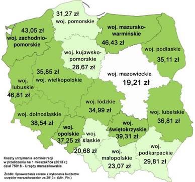 Mimo że Mazowsze jest największym i teoretycznie najzamożniejszym województwem w kraju, wydatki na administrację w przeliczeniu na jednego mieszkańca są tu najniższe w Polsce.
