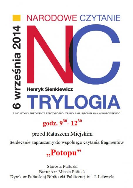 Starosta Pułtuski, Burmistrz Miasta Pułtusk oraz Dyrektor Pułtuskiej Biblioteki Publicznej im. J.Lelewela zapraszają na Narodowe Czytanie.