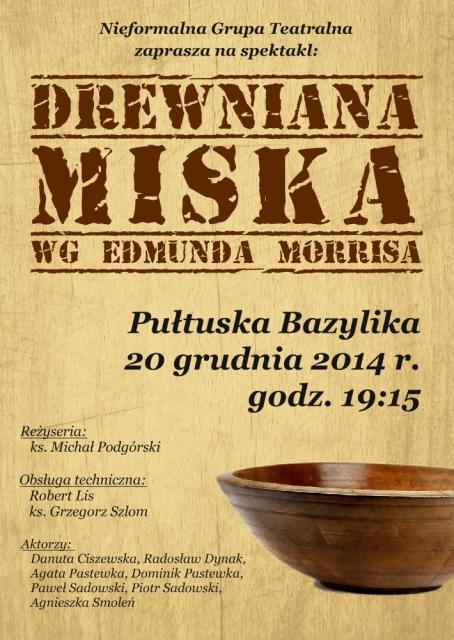 20 grudnia br. w Pułtuskiej Bazylice będzie miała miejsce premiera spektaklu teatralnego sztuki Edmunda Morrisa "Drewniana miska" w reżyserii ks. Michała Podgórskiego. W rolę aktorów wcielą się młode osoby z grup parafialnych.