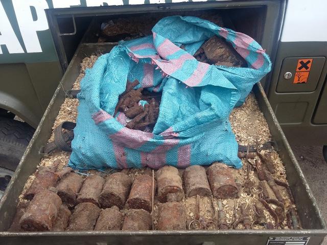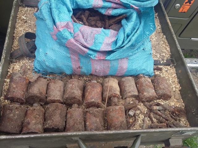 Zabezpieczono w sumie 15 granatów, 10 zapalników oraz 2400 szt amunicji strzeleckiej. Najprawdopodobniej wykopane przedmioty pochodzą z czasów II wojny światowej. Policja zabezpieczyła znalezisko do przybycia saperów.