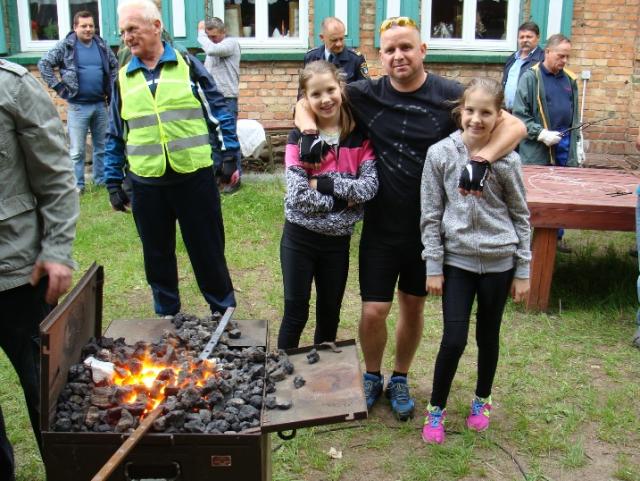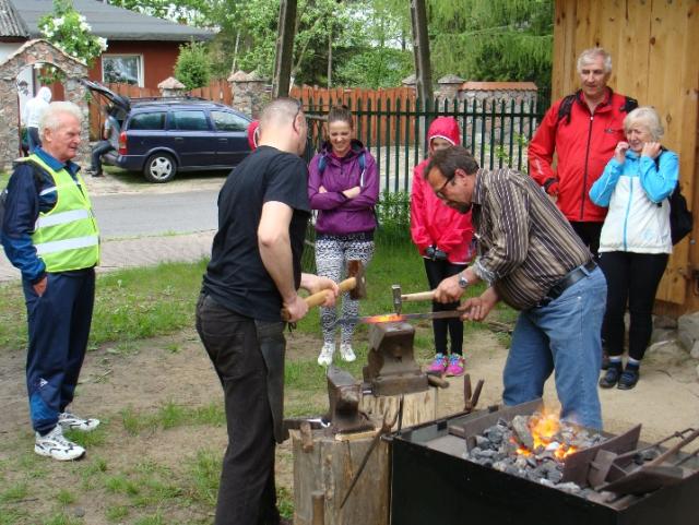 Mimo niepewnej pogody (nadawano opady deszczu), na starcie zgłosiło się jedenastu uczestników sobotniego rajdu. Rozpiętość wiekowa grupy sięgała sześćdziesięciu lat. Można by powiedzieć, że pojechały trzy pokolenia na wspólną wyprawę, której celem był udział w warsztatach kowalstwa w Kuźni Kurpiowskiej w Pniewie. Na początku rajdu odwiedziliśmy Dąb Papieski, który rośnie przy budynku Nadleśnictwa Pułtusk. Nasze trzynastoletnie bliźniaczki Julia i Oliwia miały okazję po raz pierwszy zobaczyć nie tylko gdzie rośnie dąb, ale również walory rezerwatu Wielgolas ze 180-letnim drzewostanem sosnowym. Po dotarciu do Pniewa uczestnicy rajdu zwiedzali Kuźnię Kurpiowską oraz zapoznali się z charakterystycznymi cechami regionu Puszczy Białej. Nie obyło się bez poczęstunku specjałami przygotowanymi przez Panią Halinę Witkowską - Prezesa Stowarzyszenia Puszcza Biała - Moja Mała Ojczyzna, który był bardzo ważnym wydarzeniem rajdu. Wzmocnieni na ciele, z dużym zainteresowaniem uczestniczyliśmy w pracach kowali, którzy wykonywali ruszt i stojak do grilla metodą typową dla dawnego kowalstwa łączenia metalu z metalem na gorąco. Uczestnicy rajdu w świetnych humorach rozstali się z gościnną Panią Haliną i Kuźnią Kurpiowską. Myślę, że na długo pozostaną w pamięci pozytywne wrażenia z wyprawy dla tych najmłodszych, jak i najstarszych. Po powrocie do Pułtuska na liczniku było 42 km wspaniałego wypoczynku i mile spędzonego czasu.
