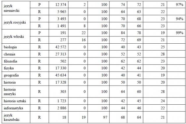 Tabela 2. Parametry statystyczne wyników egzaminów z poszczególnych przedmiotów dla absolwentów przystępujących do egzaminu maturalnego w nowej formule.
