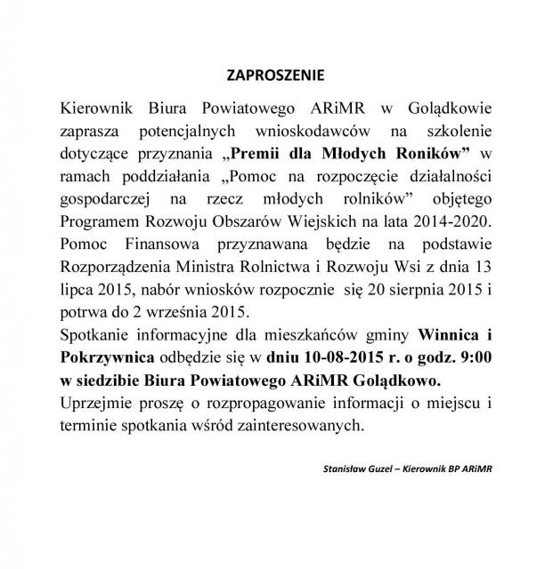 Kierownik Biura Powiatowego ARiMR w Golądkowie zaprasza potencjalnych wnioskodawców na szkolenie dotyczące przyznania "Premii dla Młodych Rolników".