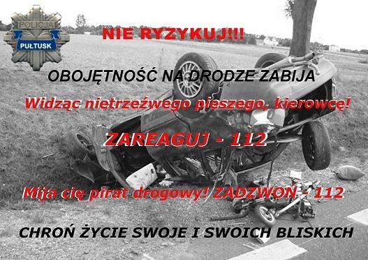 W związku z tragicznymi zdarzeniami, które miały miejsce w ostatnim czasie na drogach powiatu pułtuskiego, Wydział Ruchu Drogowego Komendy Powiatowej Policji w Pułtusku rozpoczął kampanię informacyjną "Obojętność na drodze zabija".