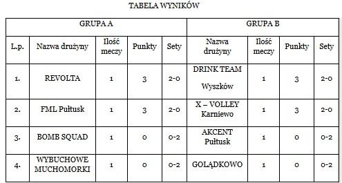 W minioną niedzielę rozegrano cztery mecze: Revolta (Mistrz ubiegłorocznych rozgrywek PALS) - Wybuchowe Muchomorki (młodzież z Liceum) wynik spotkania: 2-0 (25-10 i 25-15), w drugim; Drink Team - Golądkowo 2-0 (25-13 i 25-15),w trzecim: FML Pułtusk - BOMB SQUAD 2-0 (25 - 15 i 25 -22 i czwartym: X-Volley Karniewo - Akcent Pułtusk 2-0 (25-23 i 25-15).