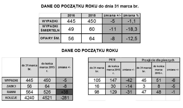 Pierwszy kwartał tego roku przyniósł poprawę bezpieczeństwa na drogach Mazowsza, na terenie funkcjonowania KWP zs. w Radomiu. Porównując ten okres zeszłego i bieżącego roku zauważalny jest spadek liczby wypadków oraz przede wszystkim mniejsza ilość ofiar śmiertelnych. W 450 wypadkach, zginęło aż o 8 osób mniej. Stanowi to spadek o blisko 10%. Bardzo cieszy również fakt, że coraz mniej pieszych ginie i odnosi obrażenia w wyniku zdarzeń drogowych. W minionym kwartale zginęło aż o niemal 47% mniej pieszych niż w roku poprzednim w tym okresie. Odrębnie monitorowane są zdarzenia zaistniałe na wyznaczonych przejściach dla pieszych. W tej kategorii w I kwartale minionego, 2015 roku zginęło 8 osób, gdy w tym roku aż o 5 mniej.