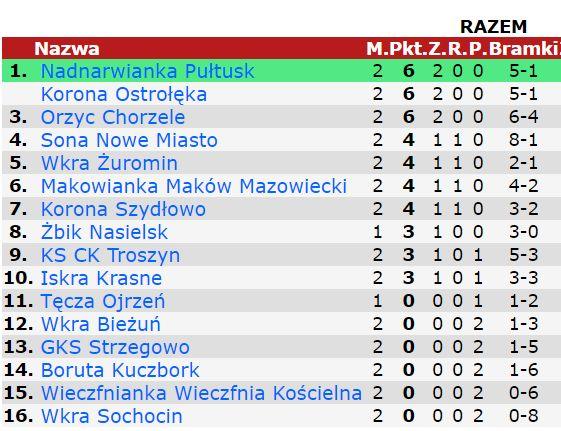 Nadnarwianka Pułtusk liderem po dwóch kolejkach ligi okręgowej ciechanowsko-ostrołęckiej.