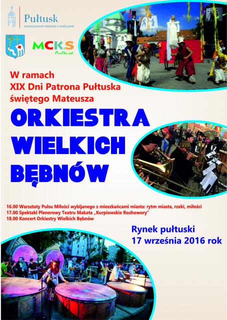 16:00 Orkiestra Wielkich Bębnów - warsztaty Pulsu Miłości wybijanego wspólnie z mieszkańcami miasta: rytm miasta, rzeki, miłości (Rynek)