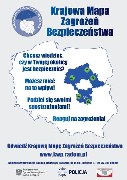 Czy w Twojej okolicy jest bezpiecznie? Chcesz wiedzieć? Możesz mieć na to wpływ. Reaguj na zagrożenia i podziel się swoimi spostrzeżeniami! Odwiedź Krajową Mapę Zagrożeń Bezpieczeństwa! Od dzisiaj "mapa" jest dostępna na stronach internetowych Komendy Wojewódzkiej Policji zs. w Radomiu.