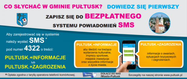 Aby zapisać swój numer telefonu w tej kategorii w systemie należy wysłać SMS na numer 4322 o treści: PULTUSK.+INFORMACJE