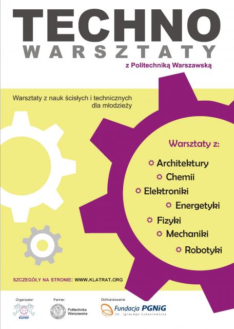 Techno-warsztaty z Politechniką Warszawską to projekt edukacyjny dofinansowany przez Fundację PGNiG i Politechnikę Warszawską, w ramach którego w 2013 roku zostanie zrealizowanych - bezpośrednio w zgłoszonych szkołach - 30 jednodniowych warsztatów z różnych dziedzin nauk ścisłych i technicznych. Projekt zaadresowany jest do uczniów z terenu województw: lubelskiego, mazowieckiego, podlaskiego, pomorskiego, świętokrzyskiego i warmińsko-mazurskiego. Warsztaty prowadzone będą przez młodych pracowników naukowo-dydaktycznych Politechniki Warszawskiej oraz studentów z kół naukowych działających na uczelni.