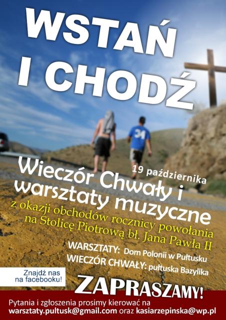 Z tej okazji, tego samego dnia odbędą się również warsztaty muzyczne, w których udział wziąć może każdy, komu muzyka w duszy gra, bez względu na wiek, czy brak wykształcenia muzycznego! Warsztaty odbędą się w Sali Maneż Domu Polonii od godz. 9.00 do 17.00. Aby wziąć udział w warsztatach wystarczy do 15.10.2013 r. wysłać swoje zgłoszenie: imię, nazwisko, wiek i parafię na adres warsztaty.pultusk@gmail.com