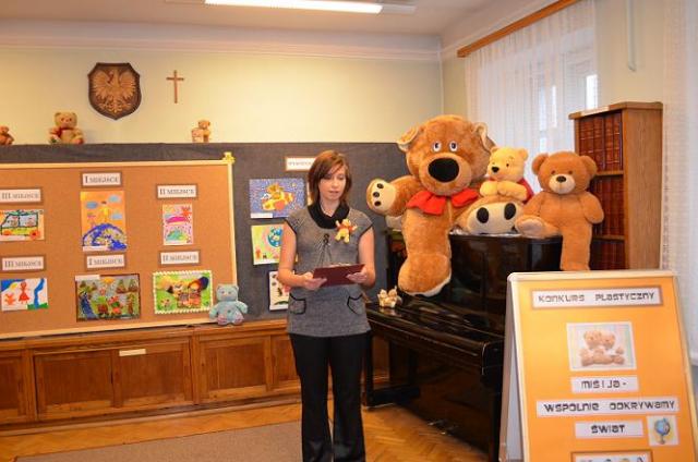 Wymienieni uczestnicy konkursu otrzymali nagrody i dyplomy, a nauczyciele podziękowania za pomoc w przygotowaniu prac uczniów. Dzieci wysłuchały historii o powstaniu tego święta, nie zabrakło również mini konkursu quizowego dla wszystkich uczestników. Uroczystość zakończyła się wspólnym odśpiewaniem piosenki "Pokochaj pluszowego misia" wspólną, pamiątkową fotografią.