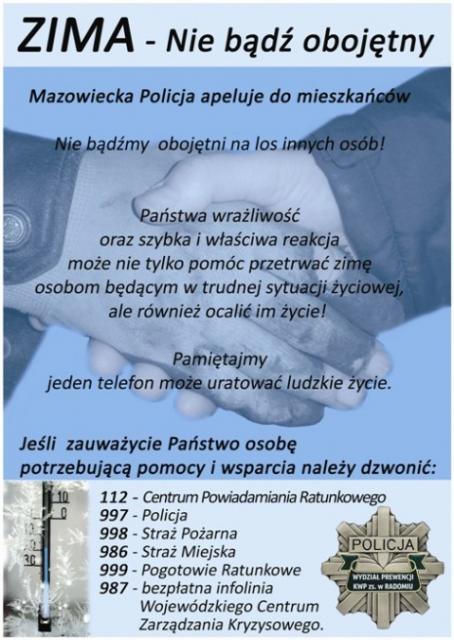 Mazowiecki Urząd Wojewódzki uruchomił bezpłatną infolinię 987. Pracownicy Wojewódzkiego Centrum Zarządzania Kryzysowego udzielają informacji na temat możliwych form wsparcia- wskazują najbliższe schroniska, jadłodajnie, czy punkty pomocy medycznej. Pod numer 987 zadzwonić może również każdy, kto zna miejsce przebywania osób bezdomnych. Odpowiednie służby zostaną o tym natychmiast poinformowane.