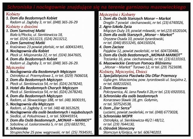 Podczas najbliższej zimy na terenie województwa mazowieckiego bezdomni będą mieli do dyspozycji 71 placówek (w tym 26 w Warszawie) posiadających łącznie 3493 miejsca (1498 w Warszawie, 95 w Radomiu, 55 w Ostrołęce, 73 w Płocku, 40 w Siedlcach). Są to zarówno noclegownie i schroniska oferujące czasowy pobyt i pełne wyżywienie, jak też hostele zapewniające stałe lub czasowe zamieszkanie, wyżywienie oraz kompleksową opiekę wspomagającą. Wyodrębniono oddzielne placówki dla kobiet, mężczyzn, matek z dziećmi i dorosłych. Pełna lista obiektów, które przyjmują bezdomnych znajduje się na stronie internetowej www.mazowieckie.pl, w zakładce Pomoc Społeczna - pomoc dla bezdomnych.