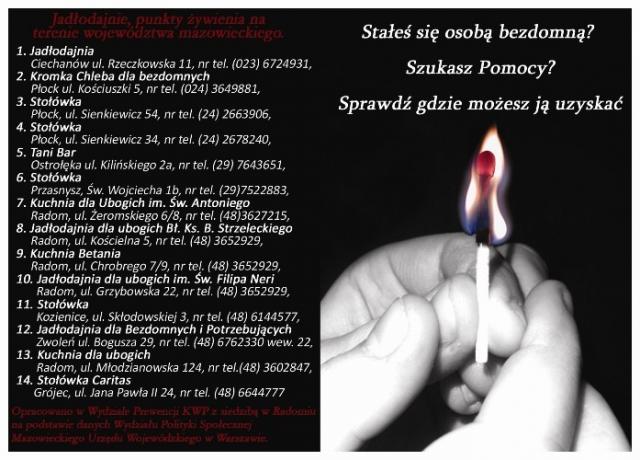 Na Mazowszu działa również 25 jadłodajni i punktów żywienia (10 w stolicy), wydających dziennie ponad 5 tys. posiłków (ok. 2,3 tys. w Warszawie). W czasie nadchodzącej zimy będą także działały punkty pomocy medycznej -- w Łaźniewie w powiecie warszawskim zachodnim (al. Księży Orionistów 1), Radomiu (ul. Główna 16) oraz w Warszawie (ul. Wolska 172). W stolicy do dyspozycji bezdomnych jest także pralnia (ul. Grochowska 259a).