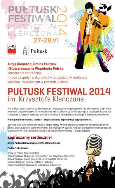 Pułtusk Festiwal im. Krzysztofa Klenczona odbędzie się w dniach 27 i 28 czerwca w mieście urodzin artysty. W ramach festiwalu odbędą się warsztaty muzyczne, projekcie filmowe, wystawa fotografii, a na dwóch festiwalowych scenach wystąpią gwiazdy polskiej sceny.