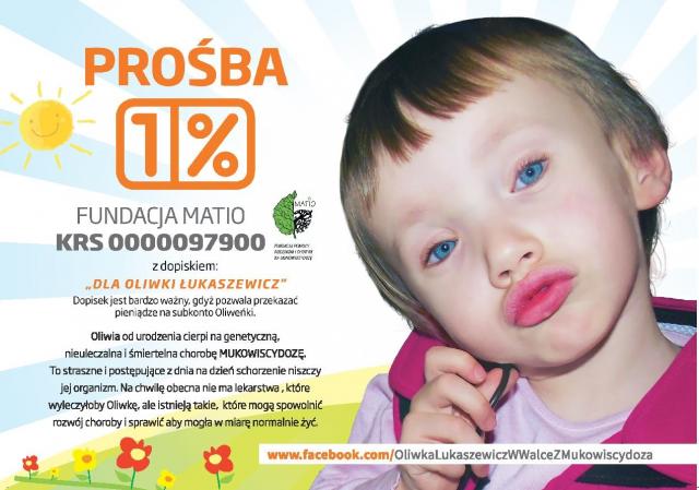 Teraz i Ty możesz pomóc 2,5 letniej Oliwce Łukaszewicz. 1 % dla małej pułtuszczanki, walczącej z ciężką, genetyczną i śmiertelną chorobą MUKOWISCYDOZĄ (CF) Cystic fibrosis nic Cię nie kosztuje.