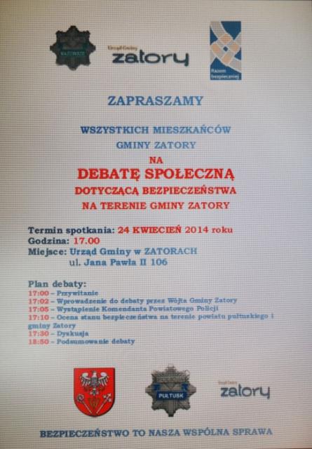 Komendant Powiatowy Policji w Pułtusku serdecznie zaprasza wszystkich mieszkańców gminy Zatory i powiatu pułtuskiego na organizowaną przez Policję i Samorząd debatę o bezpieczeństwie.